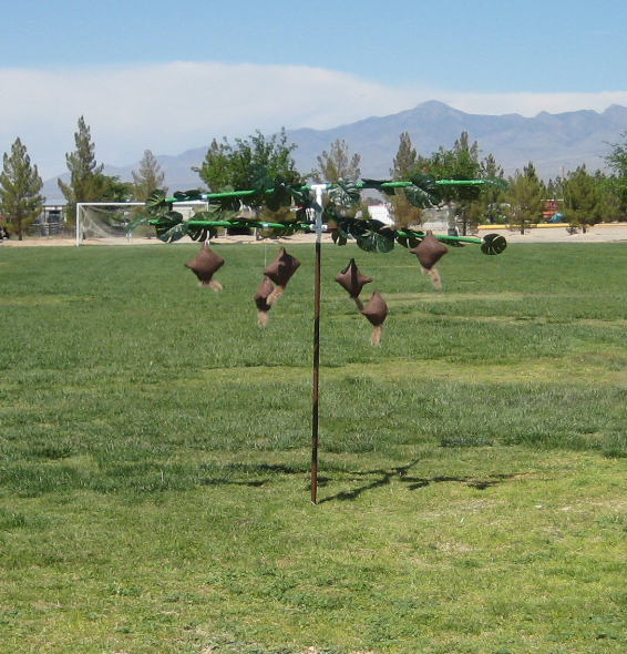 SquirrelsThe PVC tree(complete with leaves!) had the soft side of velcro attached at various points on the branches.  Burlap and fake fur squirrels were attached to shoelace/jacket cord stops that had the hook side of the velcro on them. A good hit would either piece a squirrel, or provide enough force to overcome the velcro and knock it off the tree which was also worth points.